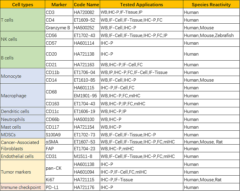 适用于多重免疫组化的抗体具有极好的靶点特异性和稳定性,它的优势在于先期严格的普通IHC筛选和多轮mIHC实验验证。Huabio提供经mIHC验证的肿瘤免疫微环境Marker抗体,如下表展示了华安研发的mIHC验证产品 23个,在为您的肿瘤免疫研究提供可靠工具的同时,还提供专业的技术支持与咨询服务。