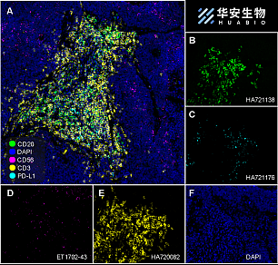 Example of multiplex IHC staining: Fluorescence multiplex immunohistochemical analysis of tertiary lymphoid structures in human small-cell lung carcinoma (FFPE). Figure A: Combined image with anti-CD20 (HA721138, green), anti-PD-L1 (HA721176, cyan), anti-CD56 (ET1702-43, magenta), anti-CD3 (HA720082, yellow), and DAPI (blue).