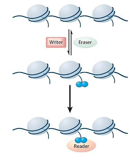 Histone Code These histone modifications work combinatorially to form a "histone code," recognized by specialized reader proteins determining chromatin states. Readers: Recognize and bind specific modifications (e.g., BRD4 binds acetylation). Writers: Enzymes catalyzing the addition of modifications (e.g., HATs, HMTs). Erasers: Enzymes removing modifications (e.g., HDACs, HDMs).