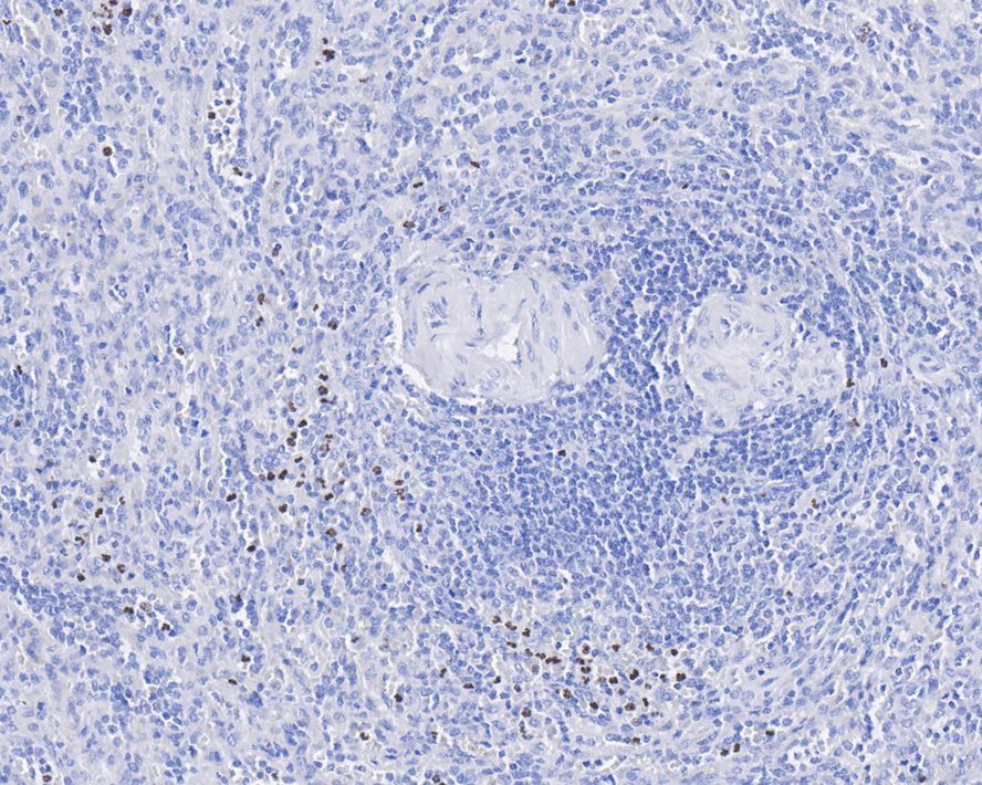 Immunohistochemical analysis of paraffin-embedded human spleen tissue with Rabbit anti-PADI4 antibody (HA721657) at 1/1,000 dilution.