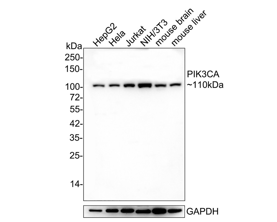 Western blot analysis of PI3 Kinase p110α on different lysates with Rabbit anti-PI3 Kinase p110α antibody (ET1606-36) at 1/1,000 dilution.