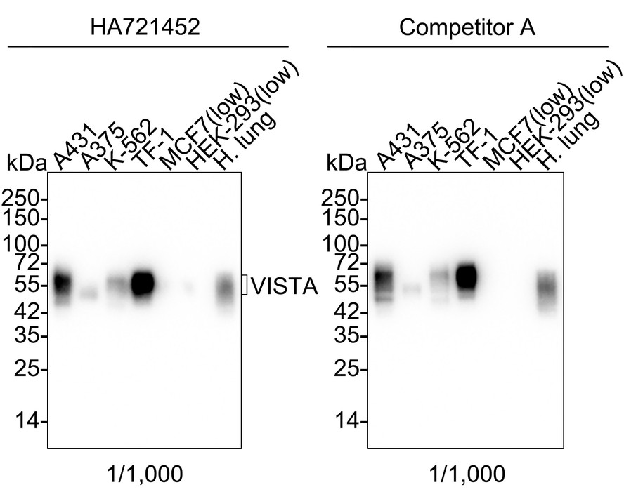 Western blot analysis of VISTA on different lysates with Rabbit anti-VISTA antibody (HA721452) at 1/1,000 dilution and competitor's antibody at 1/1,000 dilution.
