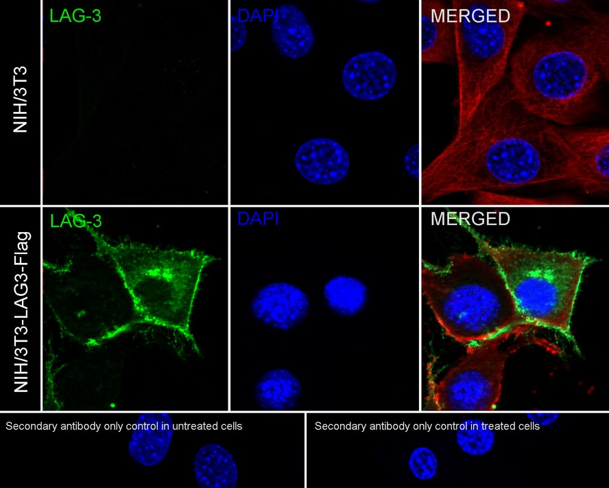 Immunocytochemistry analysis of NIH/3T3 cells transfected with or without LAG-3 labeling LAG-3 with Rabbit anti-LAG-3 antibody (HA721358) at 1/100 dilution.