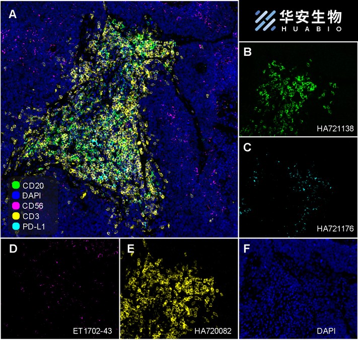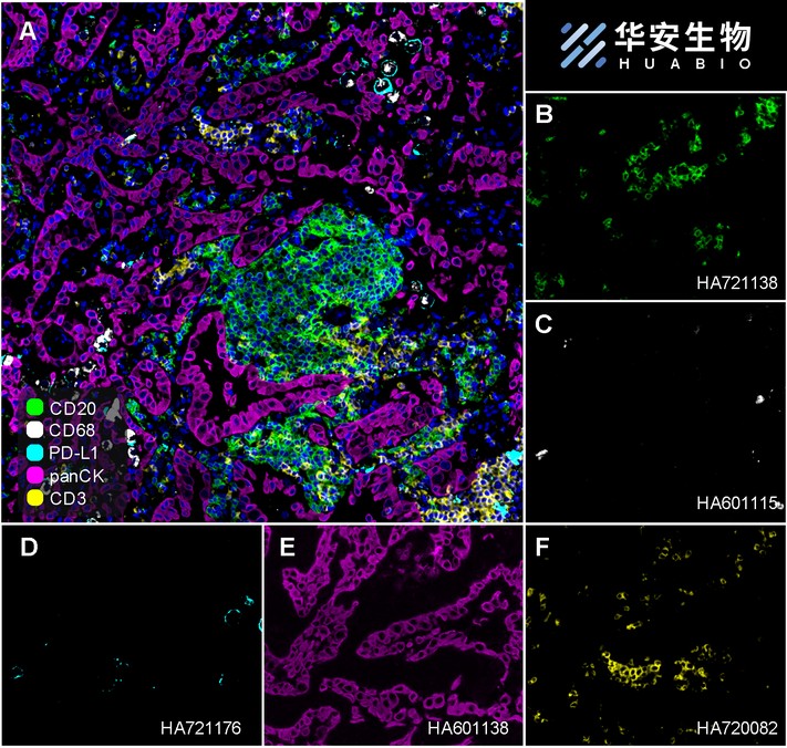 Fluorescence multiplex immunohistochemical analysis of the human non-small cell lung cancer (Formalin/PFA-fixed paraffin-embedded sections). Panel A: the merged image of anti-CD20 (HA721138, green), anti-CD68 (HA601115, gray), anti-PD-L1 (HA721176, cyan), anti-panCK (HA601138, magenta) and anti-CD3 (HA720082, yellow) on human non-small cell lung cancer. Panel B: anti- CD20 stained on B cells. Panel C: anti-CD68 stained on macrophage M1 and macrophage M2. Panel D: anti-PD-L1 stained on dendritic cells and macrophages cells. Panel E: anti-panCK stained on cancer cells. Panel F: anti-CD3 stained on T cells. HRP Conjugated UltraPolymer Goat Polyclonal Antibody HA1119/HA1120 was used as a secondary antibody. The immunostaining was performed with the Sequential Immuno-staining Kit (IRISKit™MH010101, www.luminiris.cn). The section was incubated in five rounds of staining: in the order of HA721138 (1/1,500 dilution), HA601115 (1/2,000 dilution), HA721176 (1/1,000 dilution), HA601138 (1/3,000 dilution), and HA720082 (1/500 dilution) for 20 mins at room temperature. Each round was followed by a separate fluorescent tyramide signal amplification system. Heat mediated antigen retrieval with Tris-EDTA buffer (pH 9.0) for 30 mins at 95℃. DAPI (blue) was used as a nuclear counter stain. Image acquisition was performed with Olympus VS200 Slide Scanner.