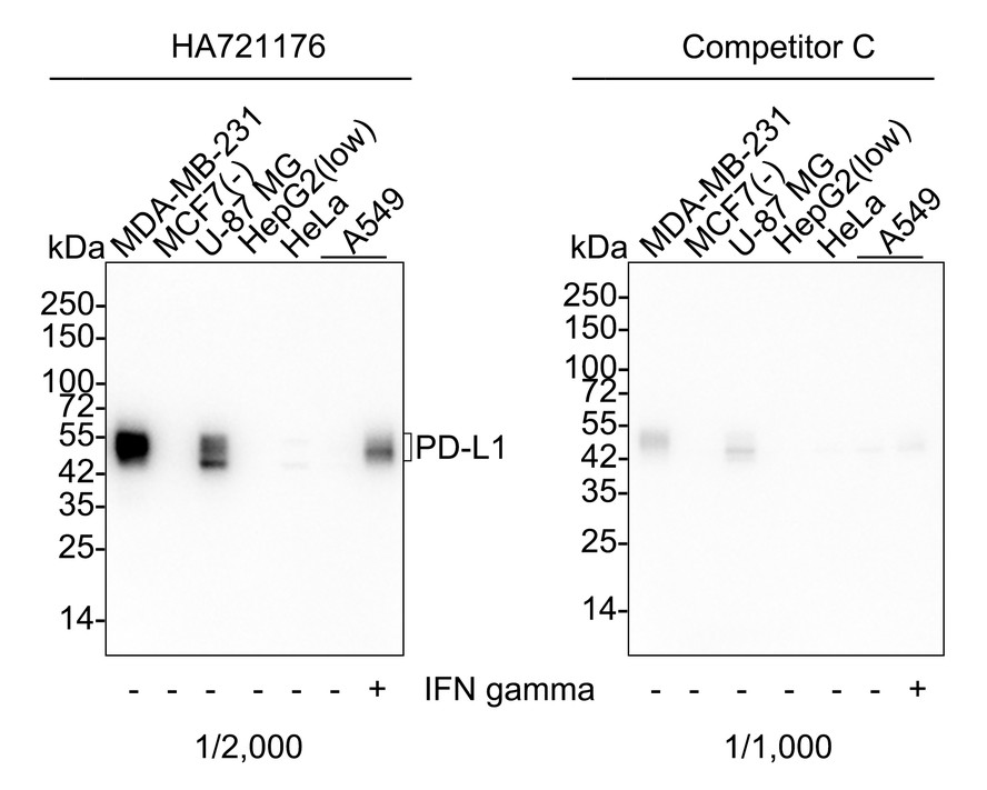 Western blot analysis of PD-L1 on different lysates with Rabbit anti-PD-L1 antibody (HA721176) at 1/2,000 dilution and competitor's antibody at 1/1,000 dilution.