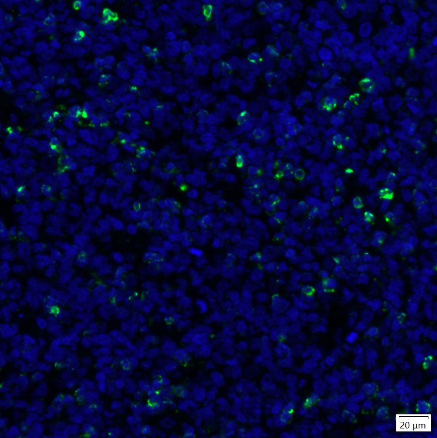 mIHC analysis of human tonsils tissue (Formalin/PFA-fixed paraffin-embedded sections) with Rabbit anti-LAG-3 antibody (HA721358) at 1/400 dilution. The immunostaining was performed with the IRISKitCmTSA Kit (900808). Heat mediated antigen retrieval with Tris-EDTA buffer (pH 9.0) for 30 mins at 95℃. DAPI (blue) was used as a nuclear counter stain. Image acquisition was performed with Olympus VS200 Slide Scanner.