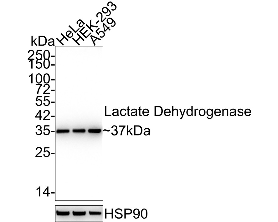 ET1608-57 was shown to specifically react with Lactate Dehydrogenase in Hela-si NT cells. Weakened band was observed when Hela-si Lactate Dehydrogenase sample was tested. Hela-si NT and Hela-si Lactate Dehydrogenase samples were subjected to SDS-PAGE. Proteins were transferred to a PVDF membrane and blocked with 5% NFDM in TBST for 1 hour at room temperature. The primary antibody (ET1608-57, 1/1,000) and Loading control antibody (Rabbit anti-GAPDH, ET1601-4, 1/10,000) were used in 5% BSA at room temperature for 2 hours. Goat Anti-rabbit IgG-HRP Secondary Antibody (HA1001) at 1:100,000 dilution was used for 1 hour at room temperature. -