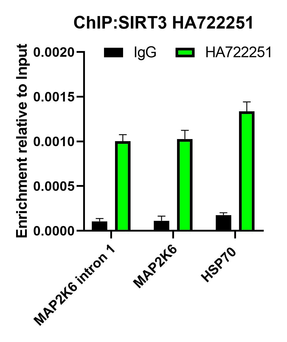 Chromatin immunoprecipitations were performed with cross-linked chromatin from HeLa cells with SIRT3 (HA722251) or Normal Rabbit IgG according to the ChIP protocol. The enriched DNA was quantified by real-time PCR using indicated primers. The amount of immunoprecipitated DNA in each sample is represented as signal relative to the total amount of input chromatin, which is equivalent to one.