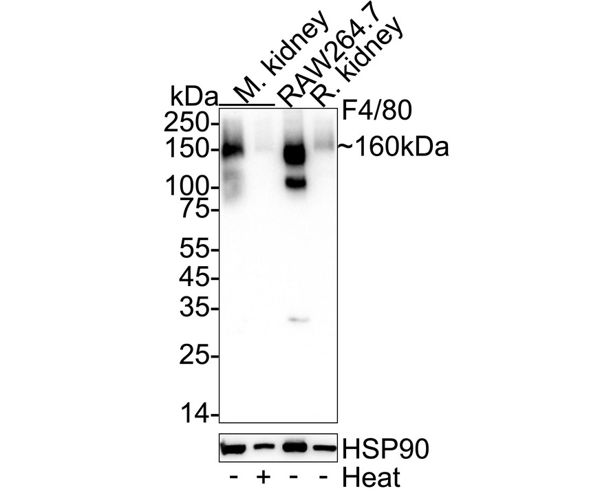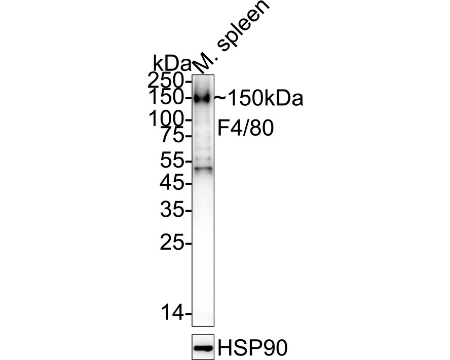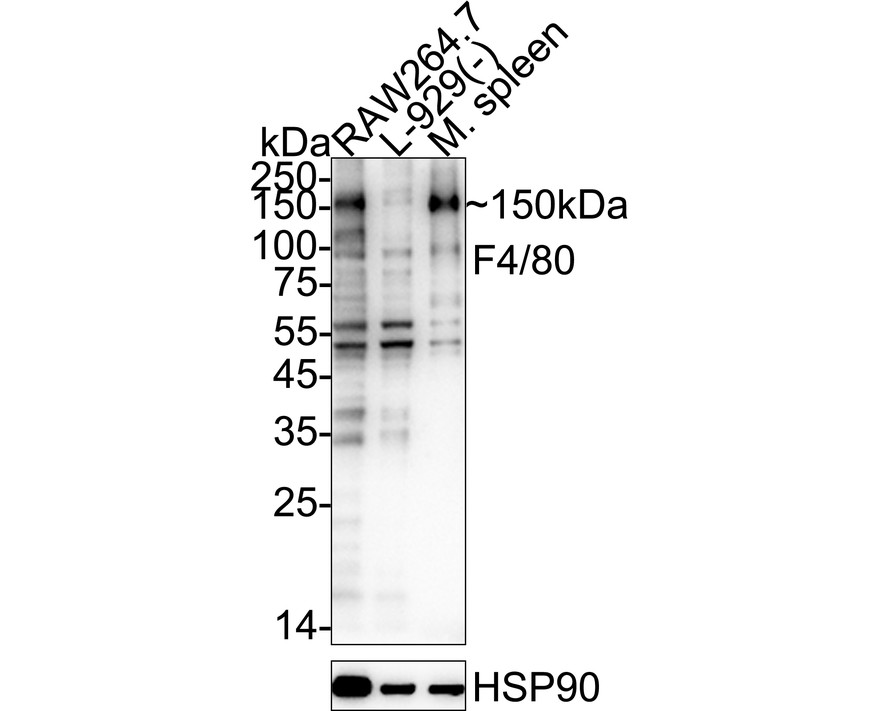 Western blot analysis of F4/80 on different lysates with Rabbit anti-F4/80 antibody (HA721520) at 1/1,000 dilution.