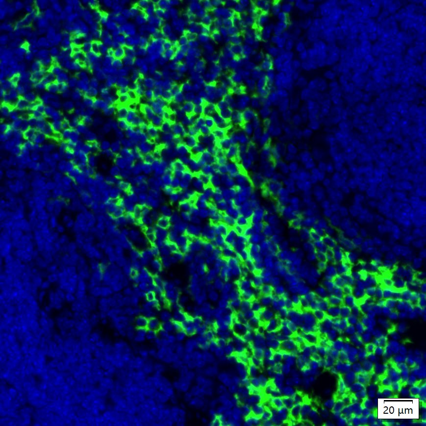Immunofluorescence analysis of frozen mouse spleen tissue with Rabbit anti-CD11c antibody (HA722830) at 1/200 dilution.