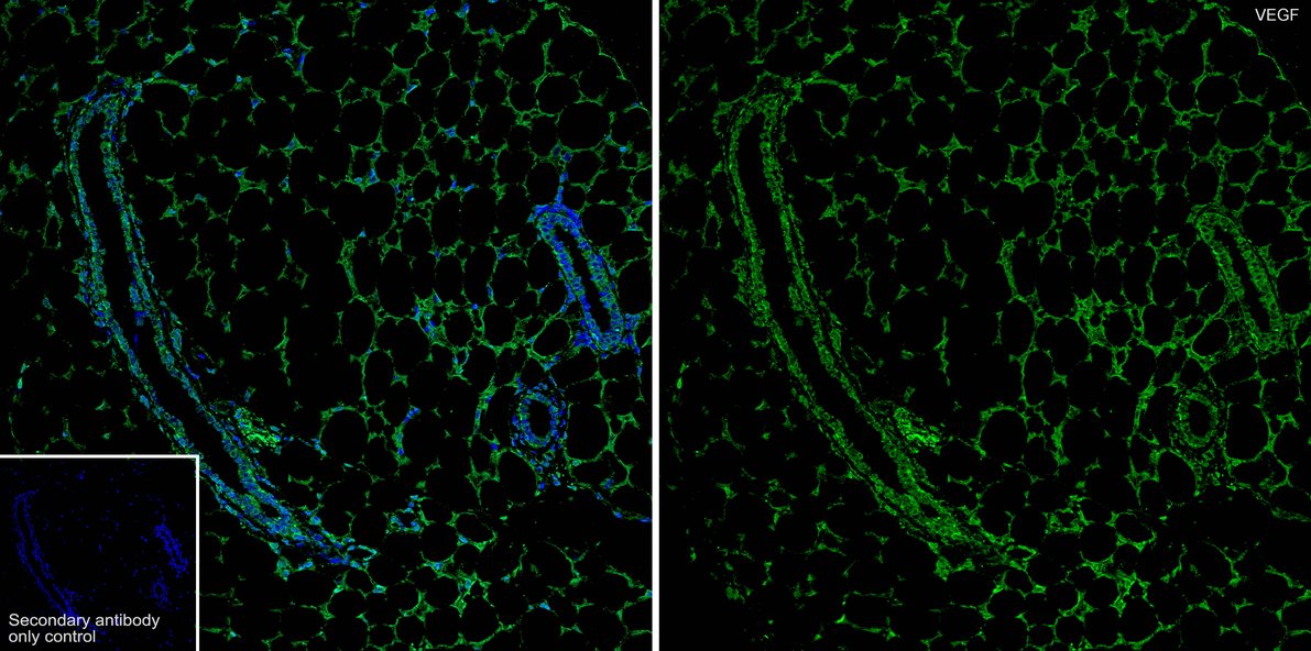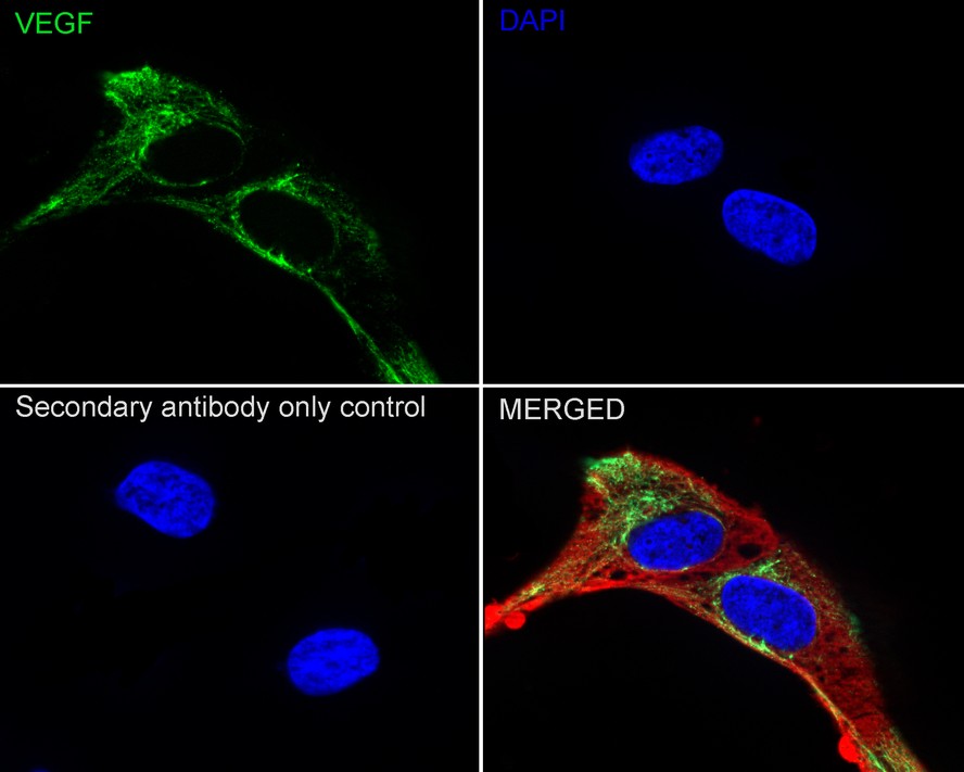 Cells were fixed in 4% paraformaldehyde for 15 minutes at room temperature, permeabilized with 0.1% Triton X-100 in PBS for 15 minutes at room temperature, then blocked with 1% BSA in 10% negative goat serum for 1 hour at room temperature. Cells were then incubated with Rabbit anti-VEGF antibody (ET1604-28) at 1/100 dilution in 1% BSA in PBST overnight at 4 ℃. Goat Anti-Rabbit IgG H&L (iFluor™ 488, HA1121) was used as the secondary antibody at 1/1,000 dilution. PBS instead of the primary antibody was used as the secondary antibody only control. Nuclear DNA was labelled in blue with DAPI.