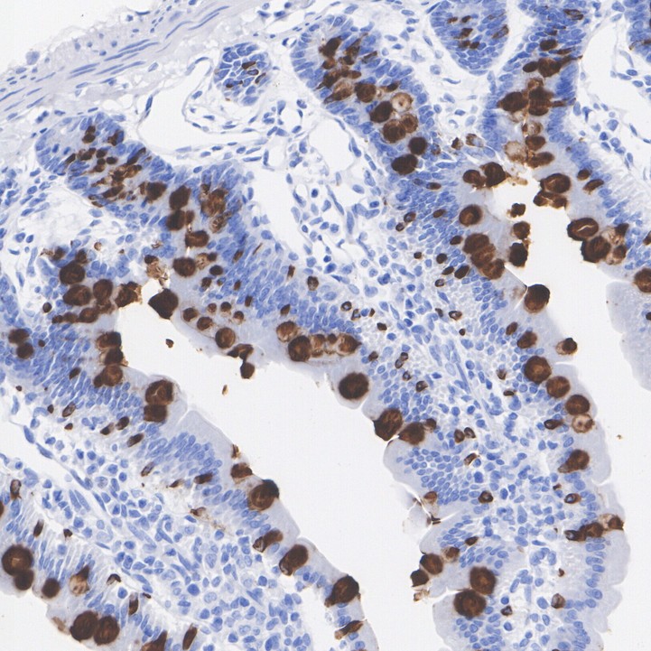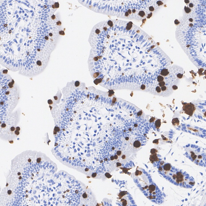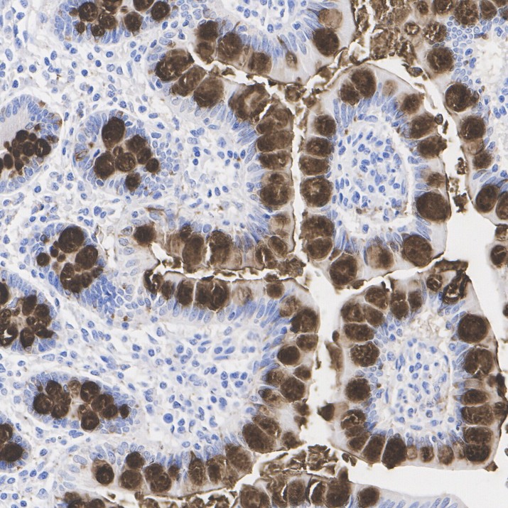 Immunohistochemical analysis of paraffin-embedded mouse small intestine tissue with Rabbit anti-MUC2 antibody (ET1704-06) at 1/1,000 dilution.