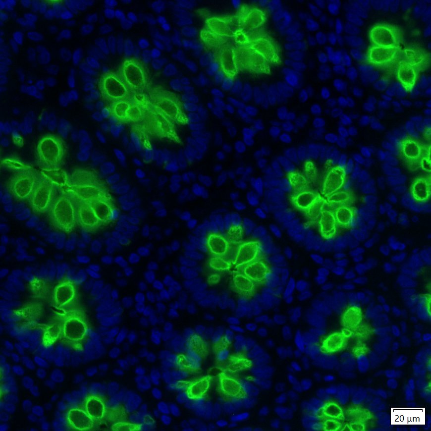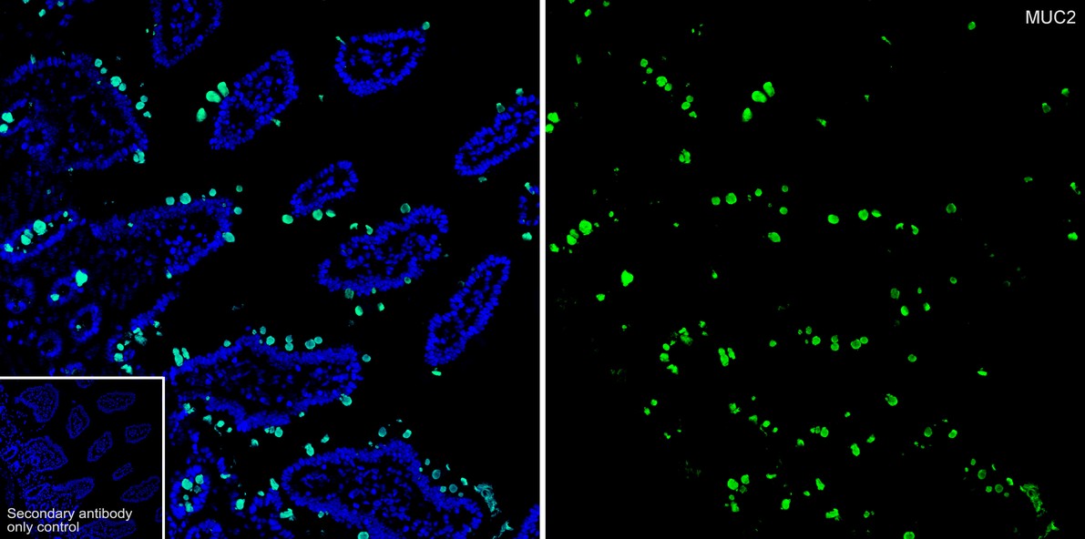 Immunofluorescence staining of paraffin-embedded human colon tissue using anti-MUC2 antibody. The section was pre-treated using heat mediated antigen retrieval with Tris-EDTA buffer (pH 9.0) for 20 minutes. The tissues were blocked in 10% negative goat serum for 1 hour at room temperature, washed with PBS, and then probed with ET1704-06 at 1/100 dilution for 10 hours at 4℃ and detected using Alexa Fluor® 488 conjugate-Goat anti-Rabbit IgG (H+L) Secondary Antibody at a dilution of 1:500 for 1 hour at room temperature.