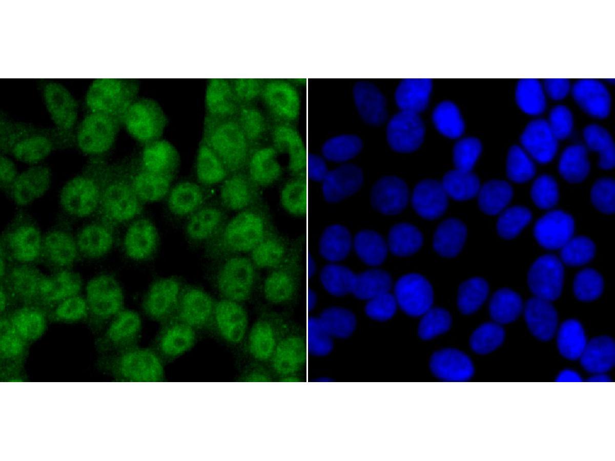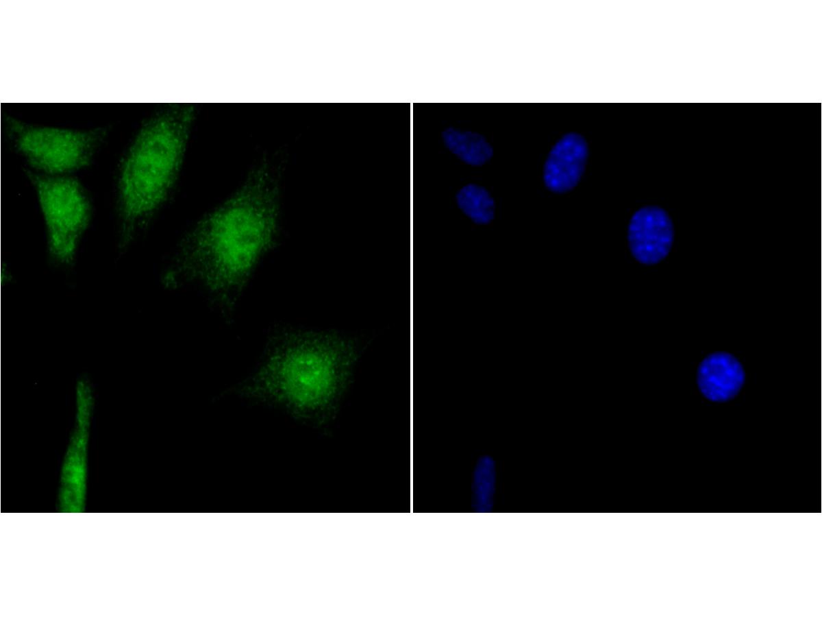 ICC staining of CAMKIV in Hela cells (green). Formalin fixed cells were permeabilized with 0.1% Triton X-100 in TBS for 10 minutes at room temperature and blocked with 1% Blocker BSA for 15 minutes at room temperature. Cells were probed with the primary antibody (ET7107-96, 1/50) for 1 hour at room temperature, washed with PBS. Alexa Fluor®488 Goat anti-Rabbit IgG was used as the secondary antibody at 1/1,000 dilution. The nuclear counter stain is DAPI (blue).