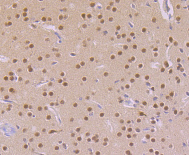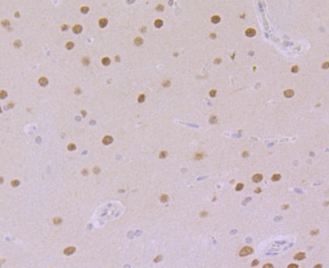 Immunohistochemical analysis of paraffin-embedded mouse brain tissue using anti-CAMKIV antibody. The section was pre-treated using heat mediated antigen retrieval with sodium citrate buffer (pH 6.0) (high pressure) for 2 minutes. The tissues were blocked in 5% BSA for 30 minutes at room temperature, washed with ddH2O and PBS, and then probed with the primary antibody (ET7107-96, 1/200) for 30 minutes at room temperature. The detection was performed using an HRP conjugated compact polymer system. DAB was used as the chromogen. Tissues were counterstained with hematoxylin and mounted with DPX.