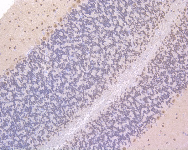 Immunohistochemical analysis of paraffin-embedded rat cerebellum tissue using anti-CAMKIV antibody. The section was pre-treated using heat mediated antigen retrieval with sodium citrate buffer (pH 6.0) (high pressure) for 2 minutes. The tissues were blocked in 5% BSA for 30 minutes at room temperature, washed with ddH2O and PBS, and then probed with the primary antibody (ET7107-96, 1/100) for 30 minutes at room temperature. The detection was performed using an HRP conjugated compact polymer system. DAB was used as the chromogen. Tissues were counterstained with hematoxylin and mounted with DPX.