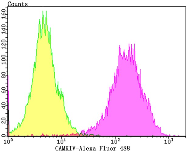 Flow cytometric analysis of CAMKIV was done on SH-SY5Y cells. The cells were fixed, permeabilized and stained with the primary antibody (ET7107-96, 1/50) (purple). After incubation of the primary antibody at room temperature for an hour, the cells were stained with a Alexa Fluor 488-conjugated Goat anti-Rabbit IgG Secondary antibody at 1/1000 dilution for 30 minutes.Unlabelled sample was used as a control (cells without incubation with primary antibody; yellow).