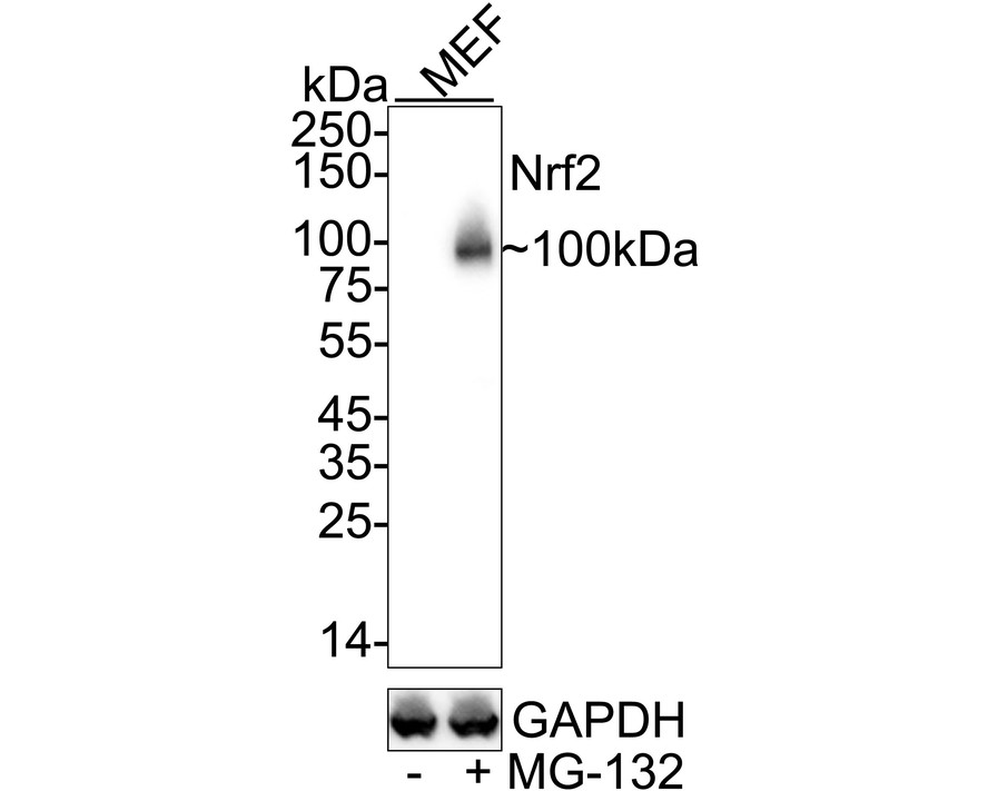 Immunocytochemistry analysis of MEF cells treated with or without 10 μM MG-132 for 6 hours labeling Nrf2 with Rabbit anti-Nrf2 antibody (ER1706-41) at 1/100 dilution.
