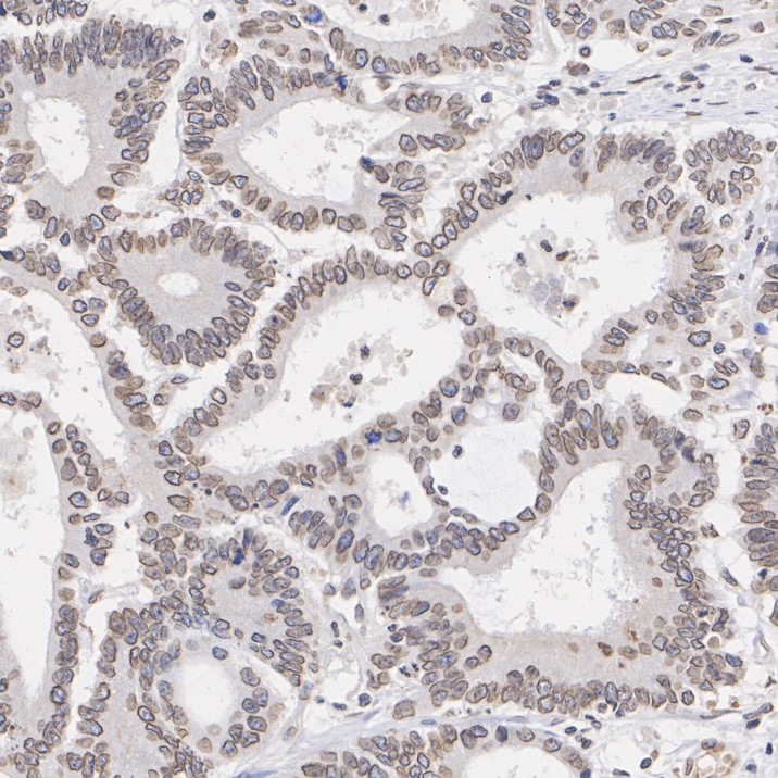 Immunohistochemical analysis of paraffin-embedded human colon cancer tissue with Rabbit anti-Lamin B2 antibody (ER0403) at 1/500 dilution.