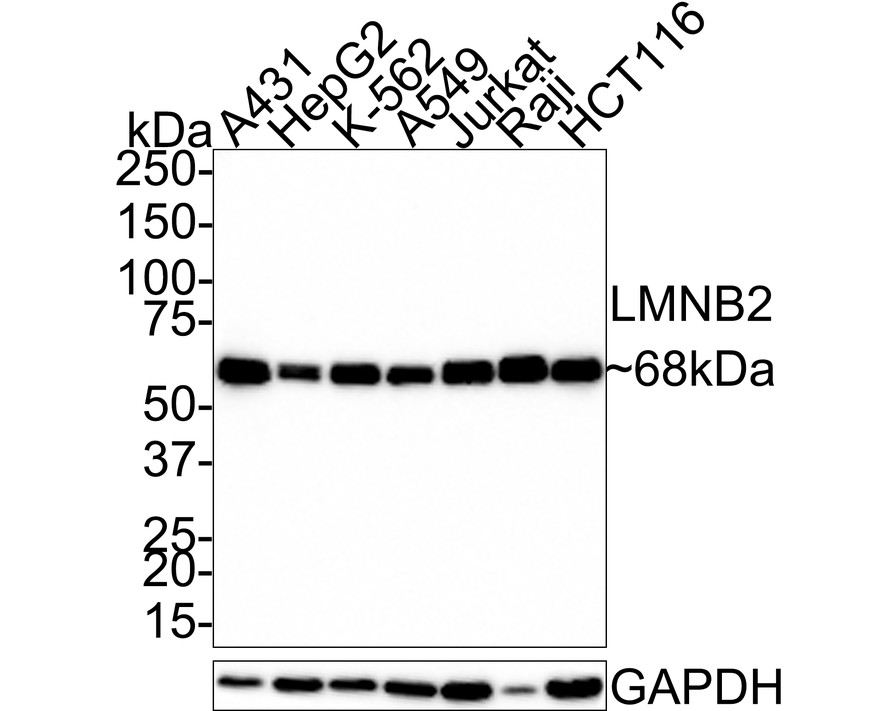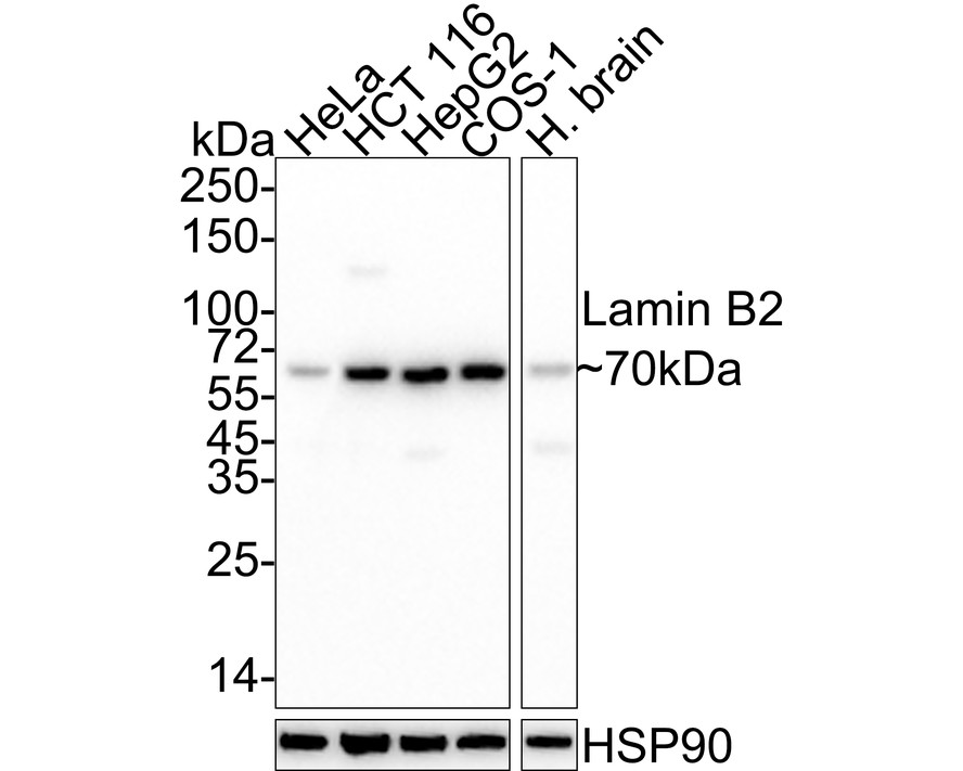 Western blot analysis of Lamin B2 on different lysates with Rabbit anti-Lamin B2 antibody (ER0403) at 1/2,000 dilution.
