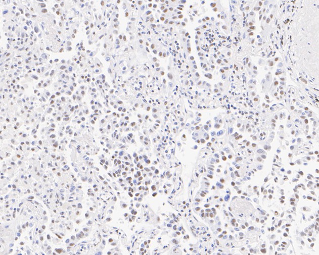 Immunohistochemical analysis of paraffin-embedded human lung carcinoma tissue using anti-NAT10 antibody. The section was pre-treated using heat mediated antigen retrieval with sodium citrate buffer (pH 6.0) (high pressure) for 2 minutes. The tissues were blocked in 5% BSA for 30 minutes at room temperature, washed with ddH2O and PBS, and then probed with the primary antibody (ET7111-23, 1/50) for 30 minutes at room temperature. The detection was performed using an HRP conjugated compact polymer system. DAB was used as the chromogen. Tissues were counterstained with hematoxylin and mounted with DPX.