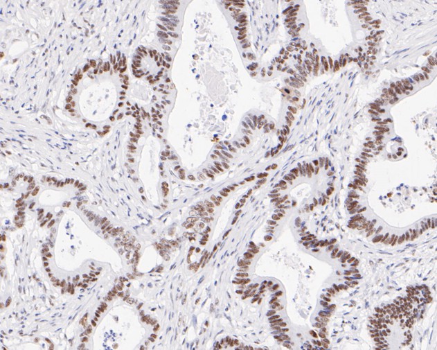 Immunohistochemical analysis of paraffin-embedded human colon carcinoma tissue using anti-NAT10 antibody. The section was pre-treated using heat mediated antigen retrieval with sodium citrate buffer (pH 6.0) (high pressure) for 2 minutes. The tissues were blocked in 5% BSA for 30 minutes at room temperature, washed with ddH2O and PBS, and then probed with the primary antibody (ET7111-23, 1/50) for 30 minutes at room temperature. The detection was performed using an HRP conjugated compact polymer system. DAB was used as the chromogen. Tissues were counterstained with hematoxylin and mounted with DPX.