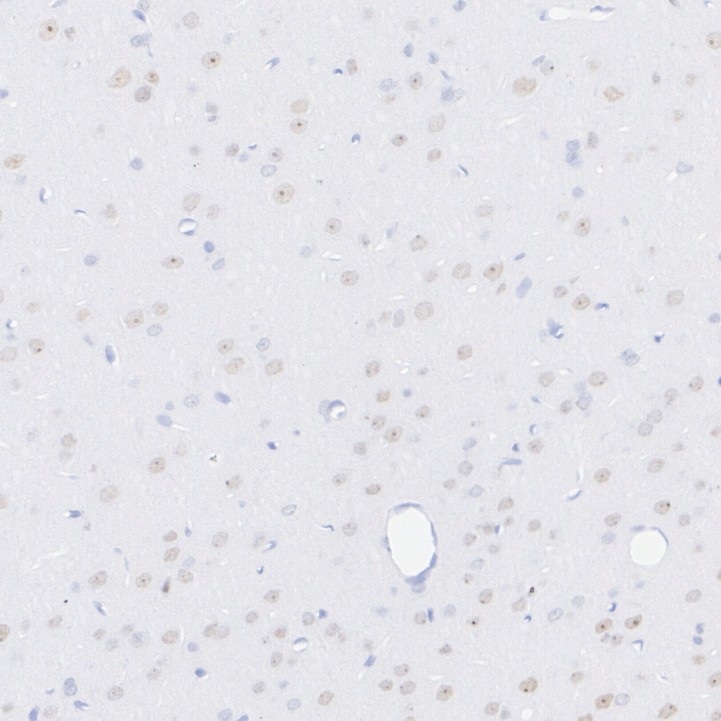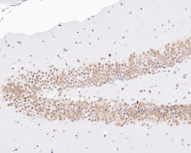 Immunohistochemical analysis of paraffin-embedded mouse brain tissue using anti-NAT10 antibody. The section was pre-treated using heat mediated antigen retrieval with sodium citrate buffer (pH 6.0) (high pressure) for 2 minutes. The tissues were blocked in 5% BSA for 30 minutes at room temperature, washed with ddH2O and PBS, and then probed with the primary antibody (ET7111-23, 1/200) for 30 minutes at room temperature. The detection was performed using an HRP conjugated compact polymer system. DAB was used as the chromogen. Tissues were counterstained with hematoxylin and mounted with DPX.