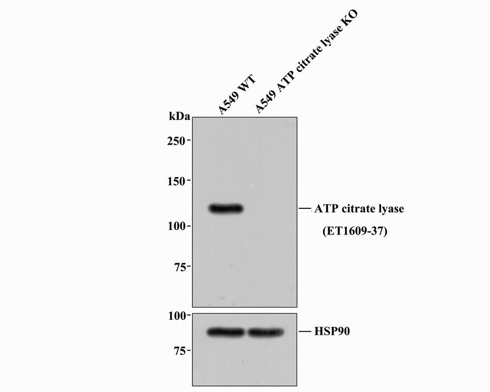 ET1609-37 was shown to specifically react with ATP citrate lyase in wild-type A549 cells. No band was observed when ATP citrate lyase knockout sample was tested. Wild-type and ATP citrate lyase knockout samples were subjected to SDS-PAGE. Proteins were transferred to a PVDF membrane and blocked with 5% NFDM in TBST for 1 hour at room temperature. The primary antibody (ET1609-37, 1/1,000) and Loading control antibody (Rabbit anti-HSP90, ET1605-56, 1/10,000)was used in 5% BSA at room temperature for 2 hours. Goat Anti-Rabbit IgG-HRP Secondary Antibody (HA1001) at 1:200,000 dilution was used for 1 hour at room temperature.