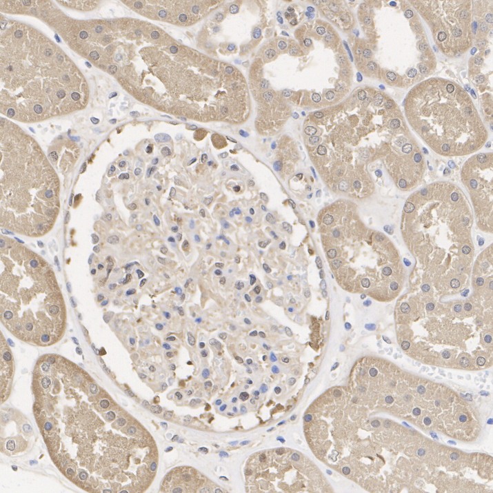 Immunohistochemical analysis of paraffin-embedded human kidney tissue with Rabbit anti-ATP citrate lyase antibody (ET1609-37) at 1/1,000 dilution.