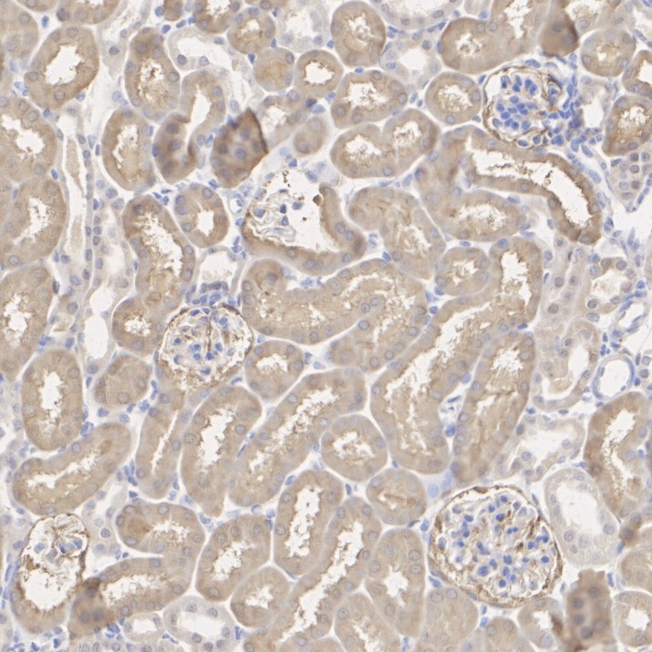 Immunohistochemical analysis of paraffin-embedded mouse kidney tissue with Rabbit anti-ATP citrate lyase antibody (ET1609-37) at 1/1,000 dilution.