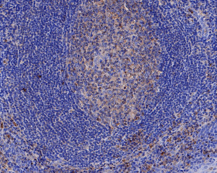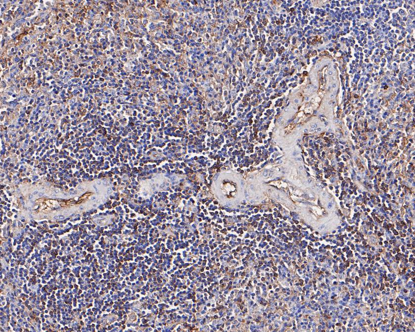 Immunohistochemical analysis of paraffin-embedded human spleen tissue with Rabbit anti-A2M antibody (ET1703-69) at 1/50 dilution.