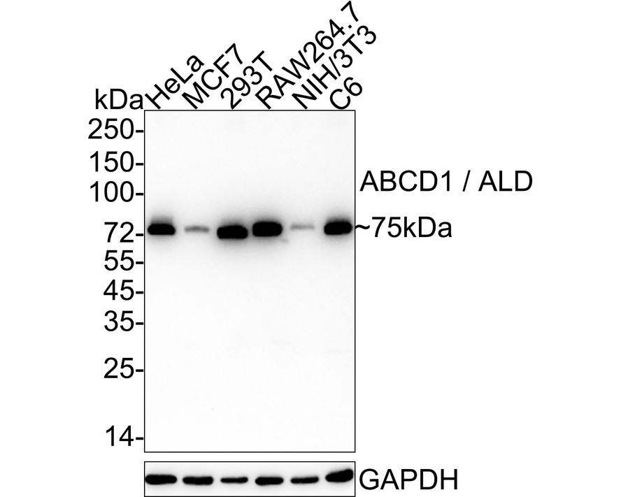 Western blot analysis of ABCD1 / ALD on different lysates with Rabbit anti-ABCD1 / ALD antibody (HA722413) at 1/1,000 dilution.