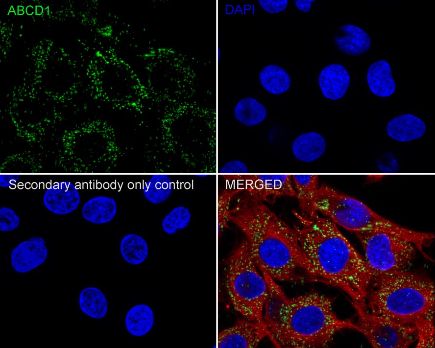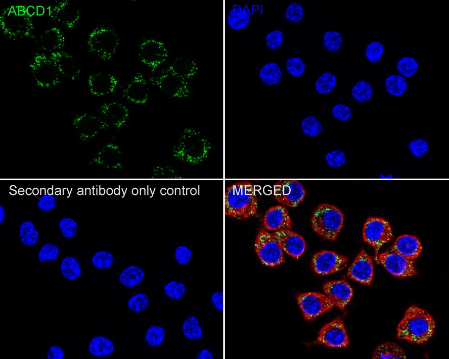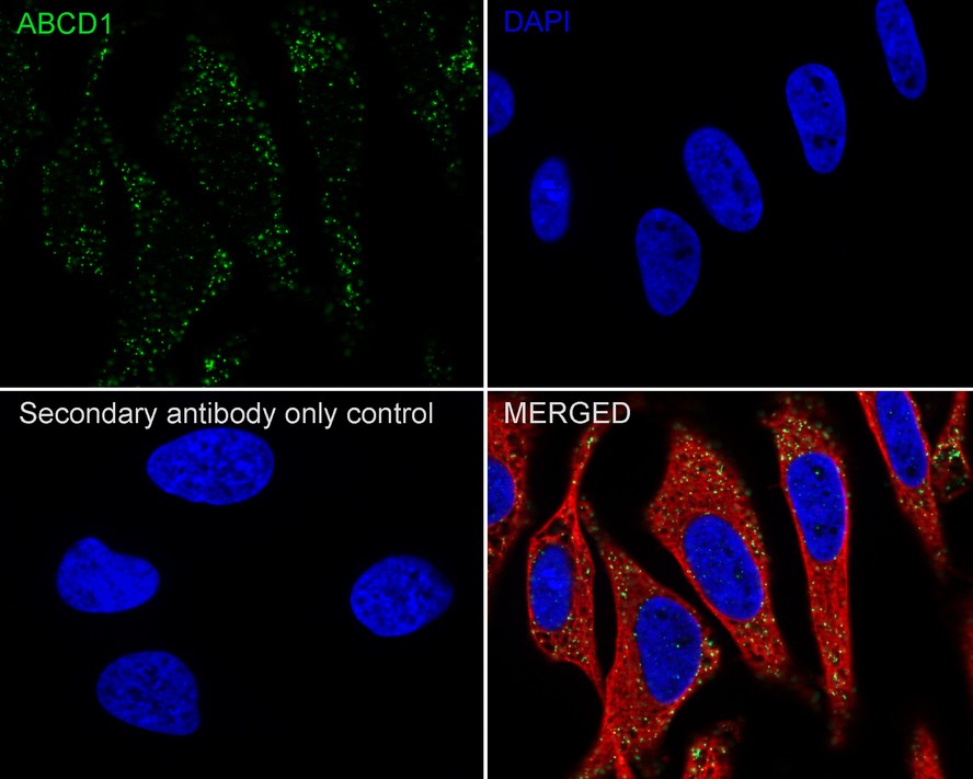 Cells were fixed in 4% paraformaldehyde for 20 minutes at room temperature, permeabilized with 0.1% Triton X-100 in PBS for 5 minutes at room temperature, then blocked with 1% BSA in 10% negative goat serum for 1 hour at room temperature. Cells were then incubated with Rabbit anti-ABCD1 / ALD antibody (HA722413) at 1/100 dilution in 1% BSA in PBST overnight at 4 ℃. Goat Anti-Rabbit IgG H&L (iFluor™ 488, HA1121) was used as the secondary antibody at 1/1,000 dilution. PBS instead of the primary antibody was used as the secondary antibody only control. Nuclear DNA was labelled in blue with DAPI. Beta tubulin (M1305-2, red) was stained at 1/100 dilution overnight at +4℃. Goat Anti-Mouse IgG H&L (iFluor™ 594, HA1126) was used as the secondary antibody at 1/1,000 dilution.