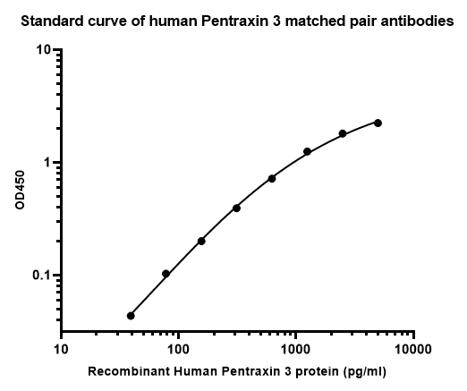 Elisa assay was performed by coating wells of a 96-well plate with 50 µl per well of capture antibody (HA723387) diluted in carbonate/bicarbonate buffer, at a concentration of 2 µg/mL overnight at 4℃. Wells of the plate were washed, blocked with 150 µl 0.05% tween-20 1% BSA blocking buffer, and incubated with serial diluted Recombinant Human Pentraxin 3 / PTX3 protein (HA210943) starting from 5,000 pg/ml to 0 pg/ml and detect antibody (HA723390, Biotin, 0.1 µg/ml) for 1 hour at 30℃ with shaking. Then the plate was washed and incubated with 50 µl per well of SA-HRP for 0.5 hour at 30℃ with shaking. Detection was performed using an Ultra TMB Substrate for 10 minutes at room temperature in the dark. The reaction was stopped with sulfuric acid and absorbances were read on a spectrophotometer at 450 nm.