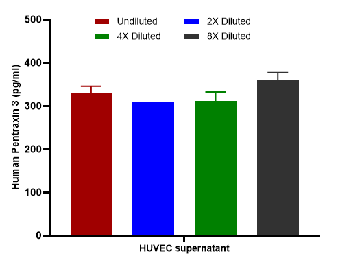 The concentrations of Pentraxin 3 were measured in duplicates, interpolated from the Pentraxin 3 standard curve and corrected for sample dilution. Undiluted samples are HUVEC cell culture supernatant 100%. The interpolated dilution factor corrected values are plotted (mean +/- SD, n=2). The mean Pentraxin 3 concentration was determined to be 327.5 pg/ml in HUVEC cell culture supernatant.