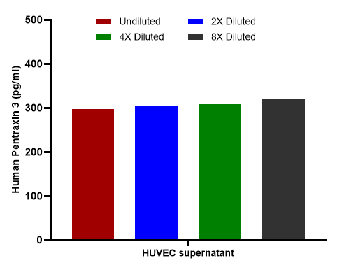 The concentrations of Pentraxin 3 were interpolated from the Pentraxin 3 standard curve and corrected for sample dilution. Undiluted samples are HUVEC cell culture supernatant 100%. The mean Pentraxin 3 concentration was determined to be 308.1 pg/ml in HUVEC cell culture supernatant.