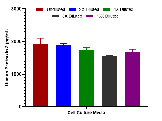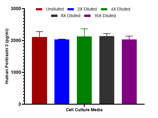 The concentrations of Pentraxin 3 were measured in duplicates, interpolated from the Pentraxin 3 standard curves and corrected for sample dilution. Undiluted samples are as follows: cell culture media 50%. The interpolated dilution factor corrected values are plotted (mean +/- SD, n=2).