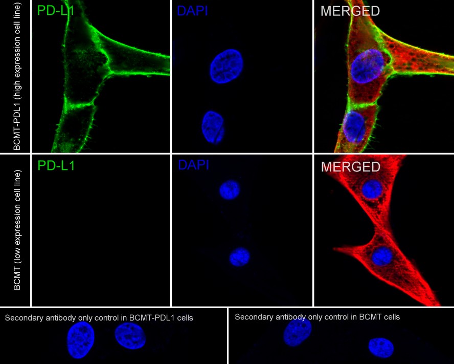 Immunocytochemistry analysis of BCMT cells transfected with PD-L1 labeling PD-L1 with Rabbit anti-PD-L1 antibody (HA722971) at 1/2,500 dilution.