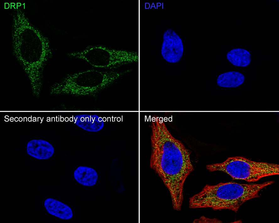 Cells were fixed in 4% paraformaldehyde for 15 minutes at room temperature, permeabilized with 0.1% Triton X-100 in PBS for 15 minutes at room temperature, then blocked with 1% BSA in 10% negative goat serum for 1 hour at room temperature. Cells were then incubated with Rabbit anti-DRP1 antibody (HA500487) at 1/2,000 dilution in 1% BSA in PBST overnight at 4 ℃. Goat Anti-Rabbit IgG H&L (iFluor™ 488, HA1121) was used as the secondary antibody at 1/1,000 dilution. PBS instead of the primary antibody was used as the secondary antibody only control. Nuclear DNA was labelled in blue with DAPI.