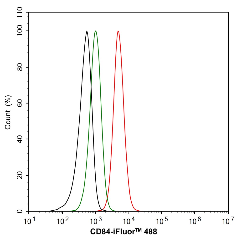 Cells were fixed in 4% paraformaldehyde for 15 minutes at room temperature, permeabilized with 0.1% Triton X-100 in PBS for 15 minutes at room temperature, then blocked with 1% BSA in 10% negative goat serum for 1 hour at room temperature. Cells were then incubated with Rabbit anti-CD84 antibody (HA720037) at 1/100 dilution in 1% BSA in PBST overnight at 4 ℃. Goat Anti-Rabbit IgG H&L (iFluor™ 488, HA1121) was used as the secondary antibody at 1/1,000 dilution. PBS instead of the primary antibody was used as the secondary antibody only control. Nuclear DNA was labelled in blue with DAPI.