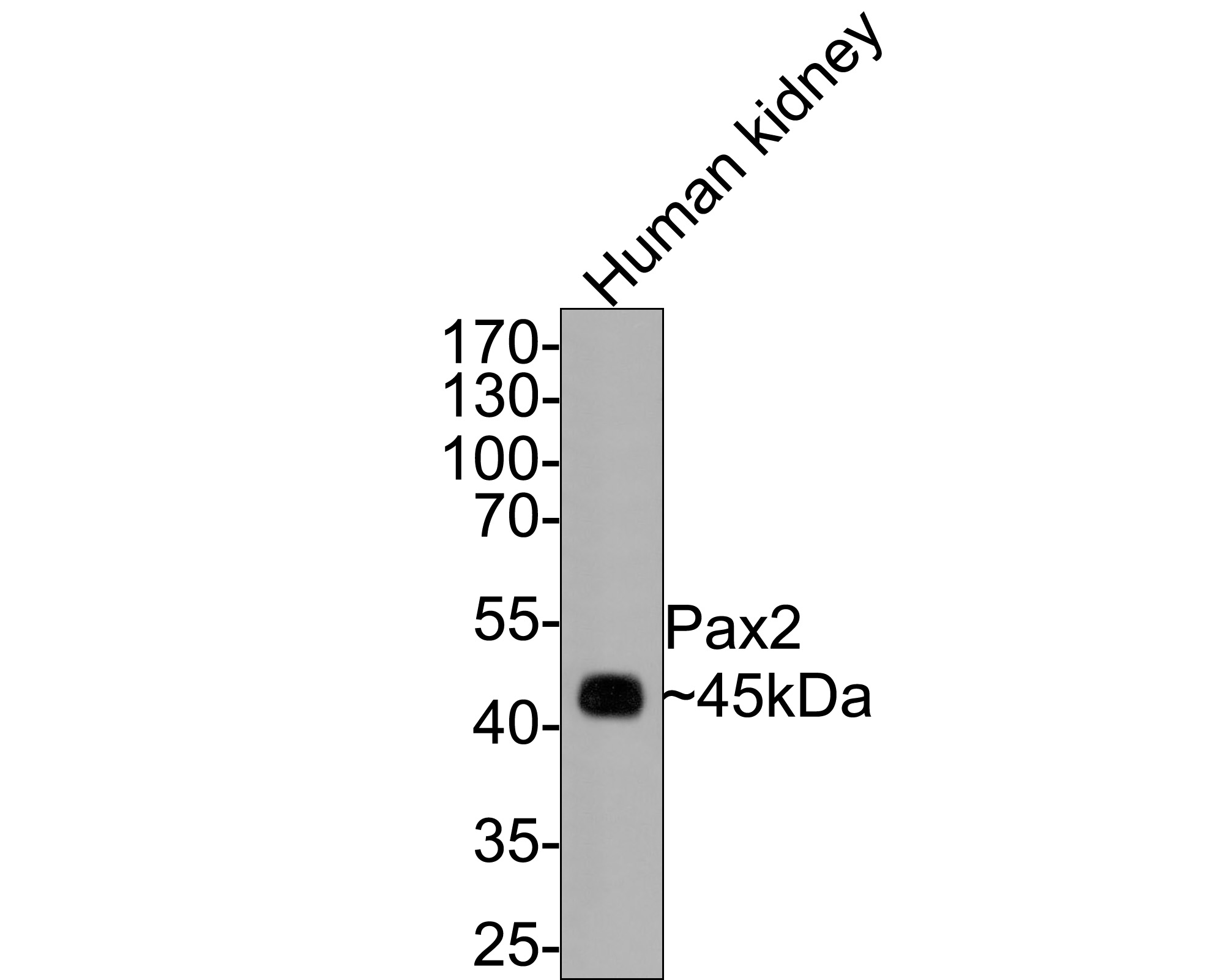 Western blot analysis of Pax2 on human kidney tissue lysates with Rabbit anti-Pax2 antibody (ET1701-23) at 1/500 dilution.
