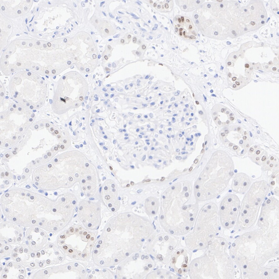 Immunohistochemical analysis of paraffin-embedded human kidney tissue with Rabbit anti-Pax2 antibody (ET1701-23) at 1/50 dilution.