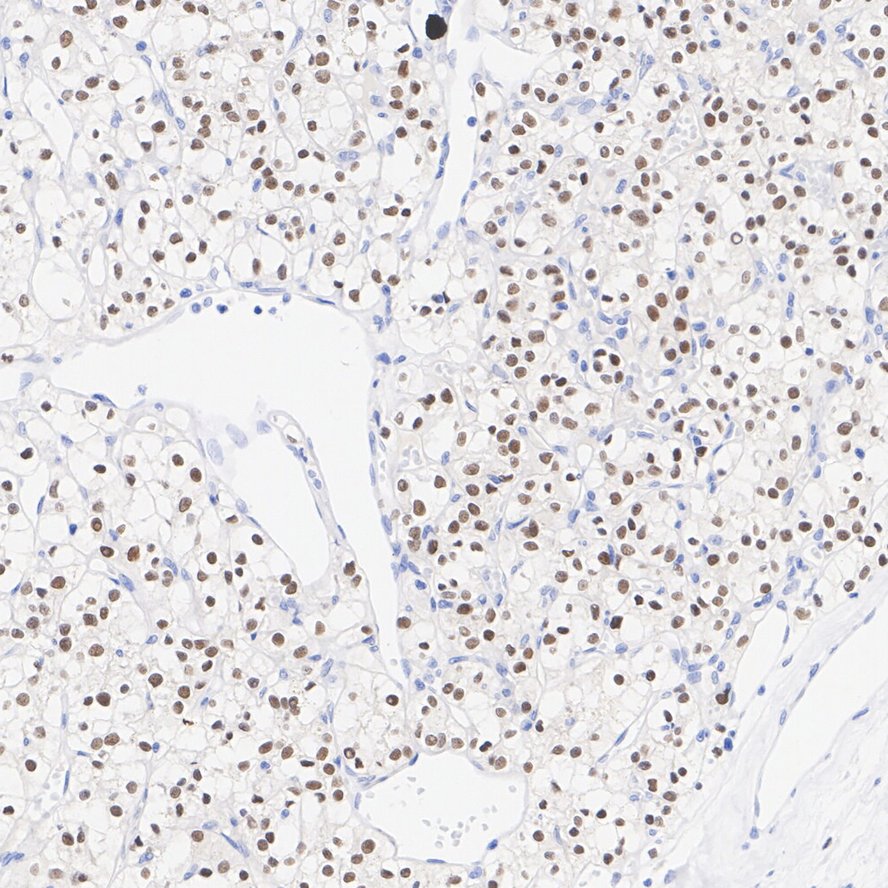 Immunohistochemical analysis of paraffin-embedded human renal clear cell carcinoma tissue with Rabbit anti-Pax2 antibody (ET1701-23) at 1/50 dilution.