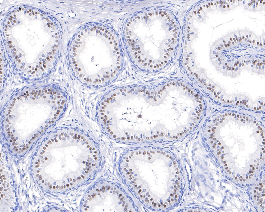 Immunohistochemical analysis of paraffin-embedded rat epididymis tissue with Rabbit anti-Pax2 antibody (ET1701-23) at 1/100 dilution.