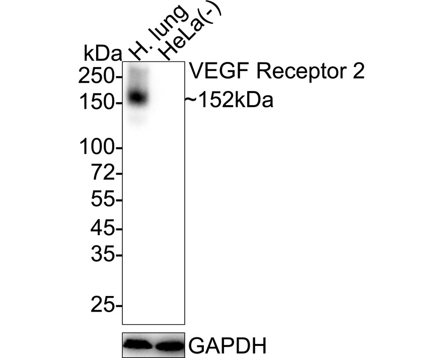 Western blot analysis of VEGF Receptor 2 on different lysates with Rabbit anti-VEGF Receptor 2 antibody (ET1608-33) at 1/1,000 dilution.