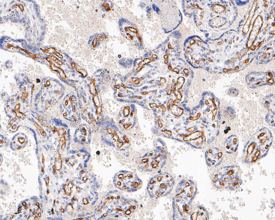 Immunohistochemical analysis of paraffin-embedded human placenta tissue with Rabbit anti-VEGF Receptor 2 antibody (ET1608-33) at 1/200 dilution.