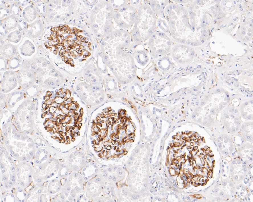 Immunohistochemical analysis of paraffin-embedded human kidney tissue with Rabbit anti-VEGF Receptor 2 antibody (ET1608-33) at 1/200 dilution.