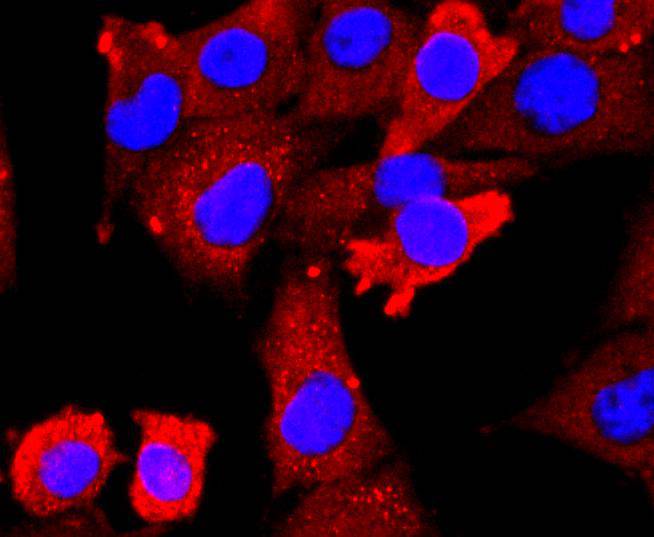 ICC staining VEGF Receptor 2 in A431 cells (red). The nuclear counter stain is DAPI (blue). Cells were fixed in paraformaldehyde, permeabilised with 0.25% Triton X100/PBS.