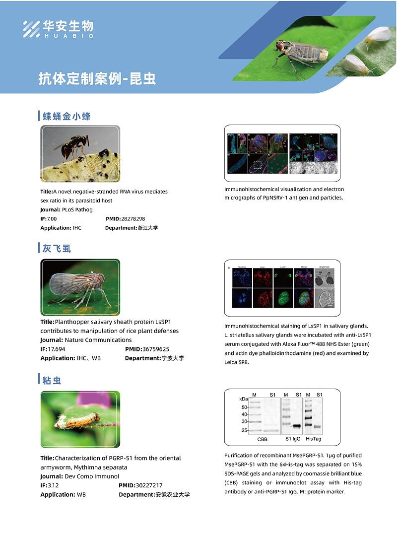 华安生物为昆虫研究领域提供个性化的抗体定制服务,适用于昆虫生物学、昆虫疾病研究等方向。我们的昆虫类抗体定制案例广泛应用于果蝇、蚊子等模式生物中,为研究昆虫的基因功能和分子机制提供了有力支持。