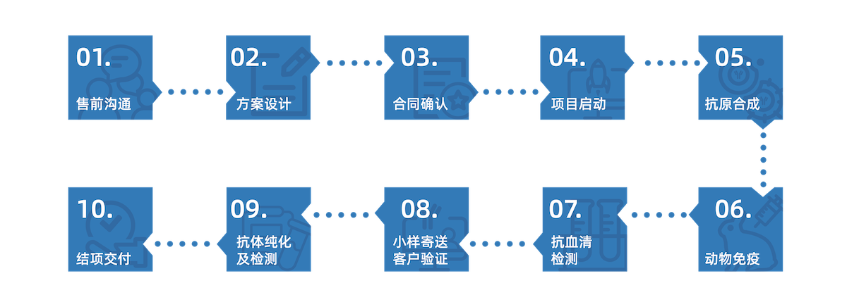 | 免疫外包服务 | 客户提供抗原,我们进行动物免疫,交付针对免疫原 ELISA 检测合格的血清。 | 免疫后的抗血清。 | 6-7 周 |